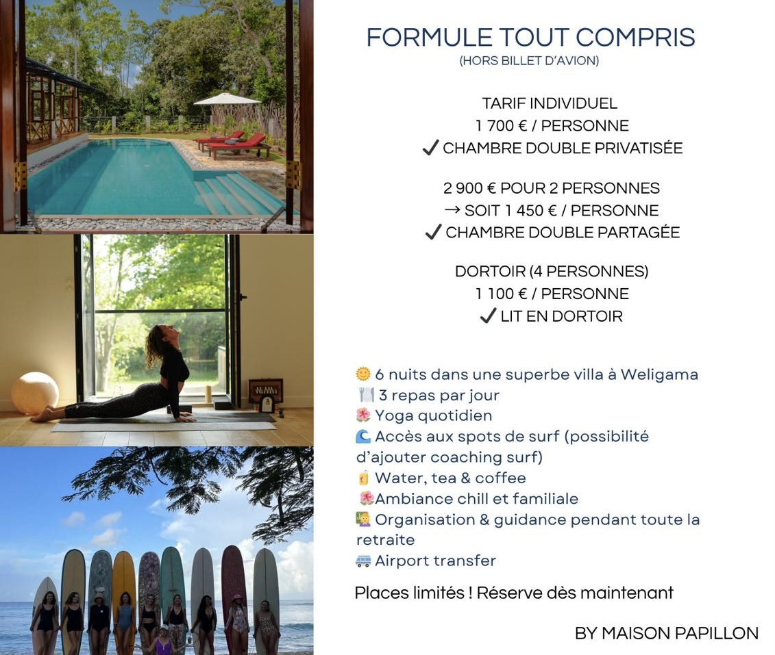 Cette retraite se déroulera dans un surf camp de charme situé à deux pas de la mer, au cœur de Weligama. Bercés par le bruit des vagues dès le réveil, nous aurons le privilège de privatiser entièrement le lieu pour vivre une expérience immersive, chaleureuse et hors du temps.